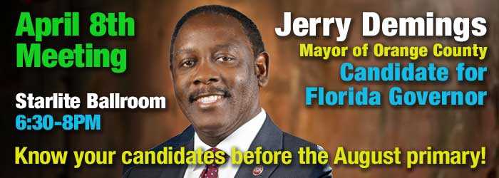 Join us as we welcome Jerry Demings, Mayor of Orlando and Candidate for Florida Governor. By attending our monthly meetings and reading our club newsletter “Beacon” you will be able to learn more about many of our Democratic candidates prior … Continue reading →